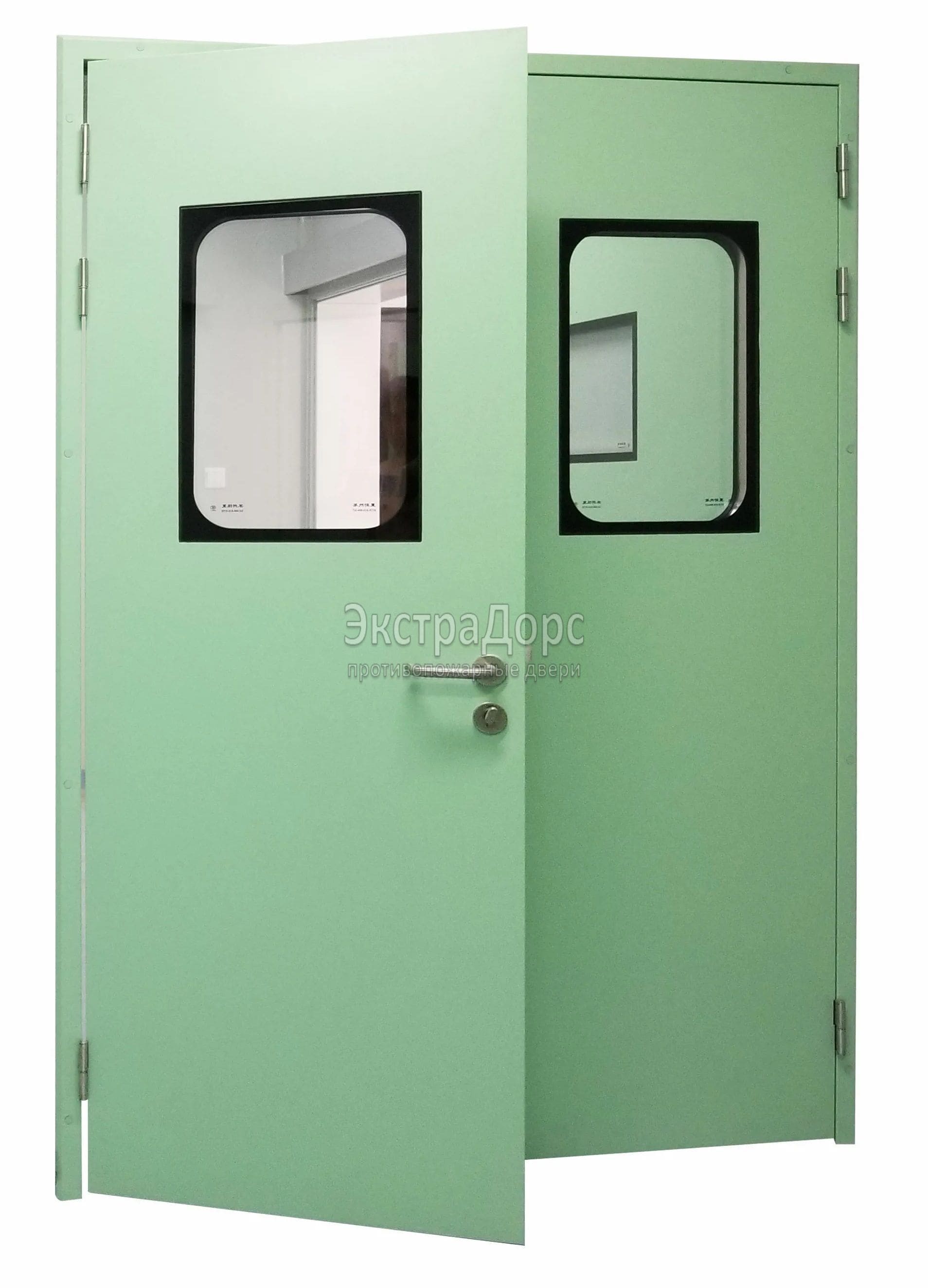 Двухстворчатая огнестойкая дверь EIW 60 зеленая со стеклом в Дубне