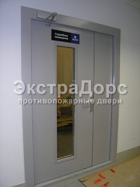 Двухстворчатая противопожарная дверь с прямоугольным стеклом в Дубне
