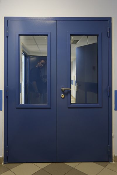 Противопожарная алюминиевая дверь синего цвета в Дубне