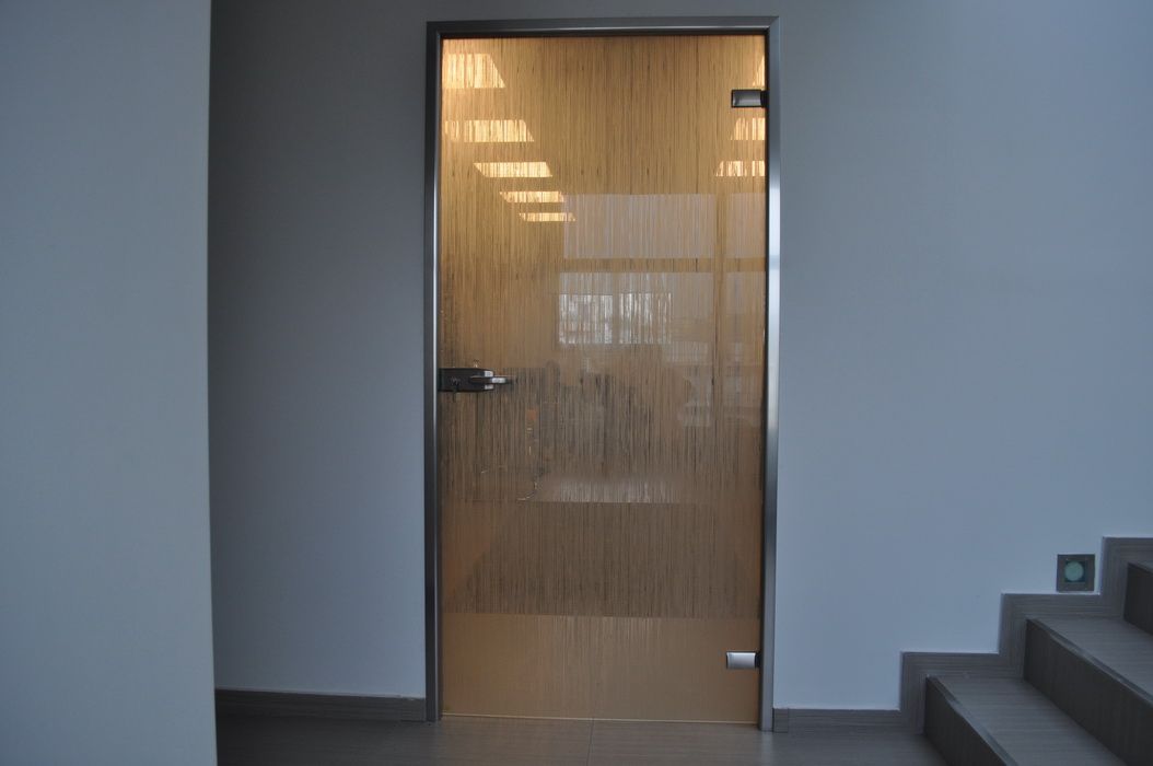 Противопожарная безрамная дверь со стеклом в БЦ в Дубне